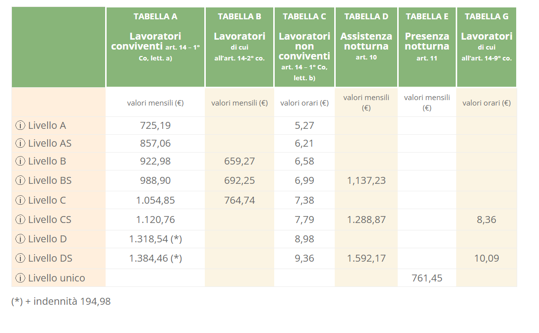 - Livello B super per discontinue prestazioni assistenziali notturne in favore di soggetti autosufficienti (bambini, anziani, portatori di handicap o ammalati). In questo caso la retribuzione minima prevista dal Ccnl e aggiornata al 1° gennaio 2023 è pari a 1,137,23 euro mensili.